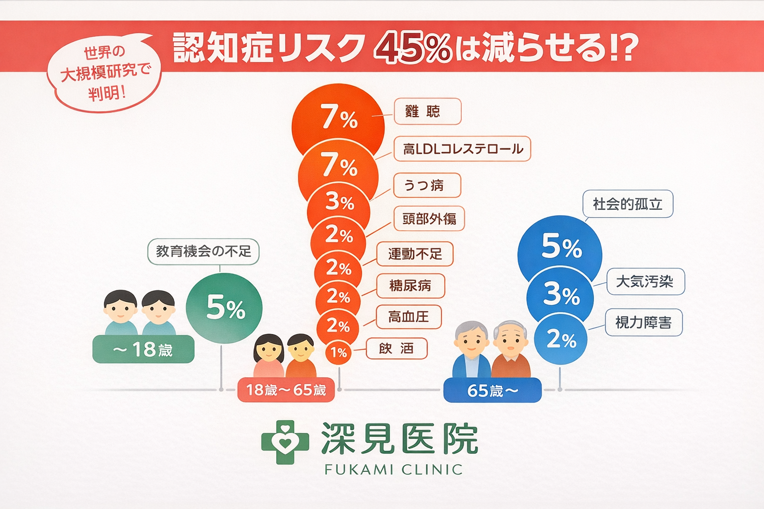 深見医院からのお知らせです。認知症のリスクは、生活習慣や疾患の治療で45%減らせることがわかりました!