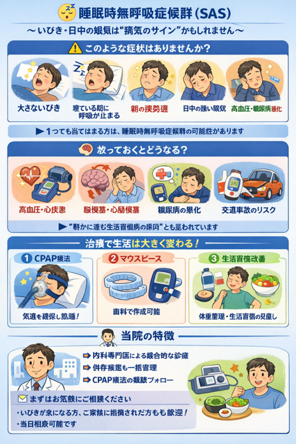深見医院からのお知らせです。睡眠時無呼吸症候群(SAS)〜いびき・日中の眠気は“病気のサイン”かもしれません〜